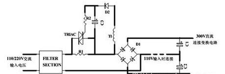 對(duì)于大功率AC-DC電源,沖擊電流限制器件在正常工作時(shí)應(yīng)該短路,這樣可以減小沖擊電流限制器件的功耗。如下圖所示:選擇R1作為啟動(dòng)電阻,在啟動(dòng)后用可控硅將R1旁路,因在這種沖擊電流防止電路中的電阻R1可以選得很大,通常不需要改變110V輸入倍壓和220V輸入時(shí)的電阻值。圖中所畫(huà)為雙向可控硅,也可以用晶閘管或繼電器將其替代。