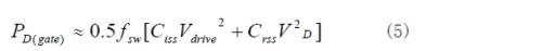 功率MOSFET驅(qū)動(dòng)效率比雙極型功率晶體管高。MOSFET柵極有兩個(gè)與漏源極相連的等效電容,即柵源電容Ciss和漏源電容Crss。MOSFET柵極驅(qū)動(dòng)的損耗來(lái)自于開(kāi)通MOSFET時(shí)輔助電壓對(duì)柵極電容的充電,關(guān)斷MOSFET時(shí)又對(duì)地放電。柵極驅(qū)動(dòng)損耗計(jì)算由式(5)給出。