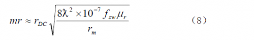 電阻損耗是變壓器或電感內(nèi)部繞組的電阻產(chǎn)生的損耗。有兩種形式的電阻損耗:直流電阻損耗和集膚效應(yīng)電阻損耗。直流電阻損耗由繞組導(dǎo)線的電阻與流過(guò)的電流有效值二次方的乘積所決定。集膚效應(yīng)是由于在導(dǎo)線內(nèi)強(qiáng)交流電磁場(chǎng)作用下,導(dǎo)線中心的電流被“推向”導(dǎo)線表面而使導(dǎo)線的電阻實(shí)際增加所致,電流在更小的截面中流動(dòng)使導(dǎo)線的有效直徑顯得小了。式(8)給出了這兩個(gè)損耗在一個(gè)表達(dá)式中的計(jì)算式。