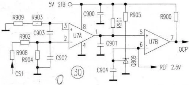 1、振動回路:開關變壓器的主繞組N1、Q1的漏--源極、R2(作業(yè)電流檢測電阻)為電源作業(yè)電流的通路;本機發(fā)動電路與其它開關電源(發(fā)動電路由降壓限流電阻組成)有所不同,發(fā)動電路由C5、D3、D4組成,供給一個“瞬態(tài)”的發(fā)動電流,二極管D2吸收反向電壓,D3具有整流作用,保證加到U1的7腳的發(fā)動電流為正電流;電路起振后,由N2自供電繞組、D2、C5整流濾波電路,供給U1芯片的供電電壓。這三個環(huán)節(jié)的正常運行,是電源可以振動起來的先決條件。