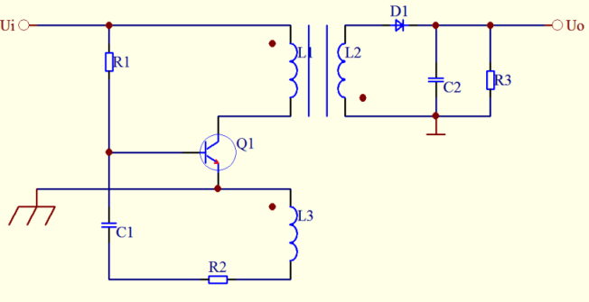 單端自激式開關(guān)電源,畫出交通通路可以發(fā)現(xiàn)變壓器的初級(jí)兩個(gè)線圈別離接三極管的三個(gè)電極,所以又稱電感三點(diǎn)式。三極管既做開關(guān)元件又做振動(dòng)元件,好處是不需要外加控制信號(hào),缺陷是不穩(wěn)定,功率低下。常用于小功率開關(guān)電源,比如一些手機(jī)的充電器便是采用這種方式。此種開關(guān)電源電路的頻率取決于C1和R2的參數(shù)。