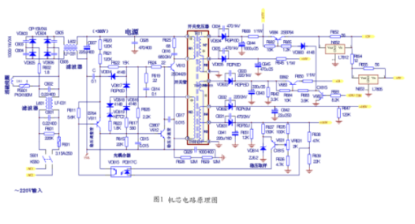 機(jī)芯的開關(guān)電源具有結(jié)構(gòu)簡(jiǎn)略,經(jīng)濟(jì)實(shí)用等特點(diǎn),是彩色電視機(jī)用得最多的一種開關(guān)電源,廣泛用于新式數(shù)碼彩電中。目前康佳、長(zhǎng)虹、海信、廈華等品牌彩電,均有許多機(jī)型使用了這一電源。本文以A25機(jī)芯為例,來(lái)剖析這種開關(guān)電源的工作過程及檢修辦法,詳細(xì)電路見圖1。