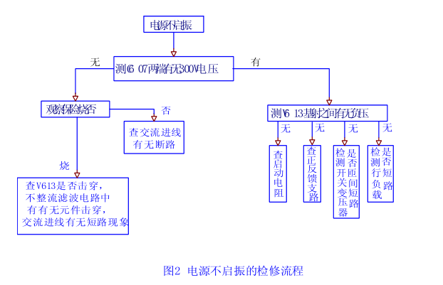 這種狀況說(shuō)明電源不啟振,可按圖2所示的流程進(jìn)行檢修。