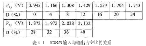 通過實驗可知,UC3825的2腳輸入和outA.、outB輸出的PWM脈沖信號的占空比是滿足線性關(guān)系的。具休實驗數(shù)據(jù)如表4-1所示。我們定義UC3825的2腳輸入為v2,輸出的PM信號占空比為D。從表41中的數(shù)據(jù)可以看出,端口2的數(shù)值范鬧為:0.945V~-2.132v,而PWM脈沖信號的占空比在0%~-40%之間變化,與上述的結(jié)論是吻合的。