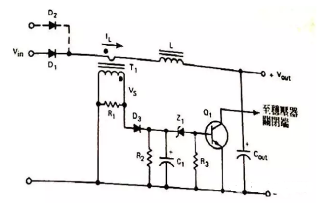 工作原理是:T1用來檢測負(fù)載電流IL,因此電阻R1會有成比例的電壓產(chǎn)生。D3為整流二極管,R3C1整流后的濾波電路,若電流過載發(fā)生時(shí),電容器C1上的電壓會增加到穩(wěn)壓二極管Z1的導(dǎo)通電壓,此時(shí)三極管Q1會導(dǎo)通,因此Q1集電極上的信號可以關(guān)閉穩(wěn)壓器的驅(qū)動信號。