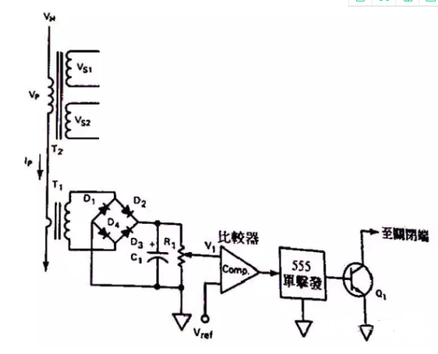 T1用來檢測T2的初級電流,T1后經(jīng)二極管整流后電容濾波,可變電阻R1用來設(shè)定比較器輸入端的臨限電壓,在正長工作情況下,比較器的Vref參考輸入端電壓會高于電衛(wèi)器R1上的電壓,此時(shí)比較器的輸出會在高電平,此時(shí)的555IC(單激多諧振蕩器)會有低電平的輸出,使Q1保持在關(guān)閉狀態(tài)。
