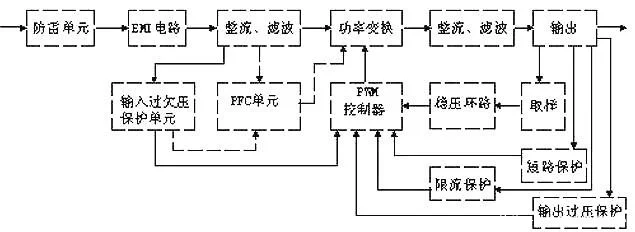 開關(guān)電源的首要電路是由輸入電磁攪擾濾波器(EMI)、整流濾波電路、功率變換電路、PWM操控器電路、輸出整流濾波電路組成。輔助電路有輸入過欠壓維護(hù)電路、輸出過欠壓維護(hù)電路、輸出過流維護(hù)電路、輸出短路維護(hù)電路等組成的。