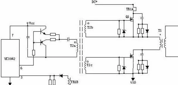 輸出限壓維護(hù)電路:輸出限壓維護(hù)電路如下圖,當(dāng)輸出電壓升高,穩(wěn)壓管導(dǎo)通光耦導(dǎo)通,Q1基極有驅(qū)動電壓而道通,UC3842③電壓升高,輸出下降,穩(wěn)壓管不導(dǎo)通,UC3842③電壓下降,輸出電壓升高。循環(huán)往復(fù),輸出電壓將安穩(wěn)在一范圍內(nèi)(取決于穩(wěn)壓管的穩(wěn)壓值)。