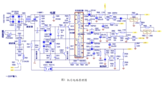 機(jī)芯的開關(guān)電源具有結(jié)構(gòu)簡(jiǎn)略,經(jīng)濟(jì)實(shí)用等特點(diǎn),是彩色電視機(jī)用得最多的一種開關(guān)電源,廣泛用于新式數(shù)碼彩電中。目前康佳、長(zhǎng)虹、海信、廈華等品牌彩電,均有許多機(jī)型使用了這一電源。本文以A25機(jī)芯為例,來分析這種開關(guān)電源的作業(yè)進(jìn)程及檢修方法,具體電路見圖1。