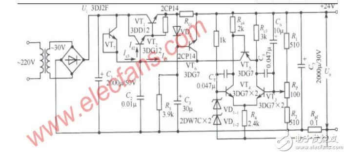 實用電路如下圖,比例電阻R1和R2的阻值之比設(shè)置為1:18.51,輸出電壓就等于24伏。