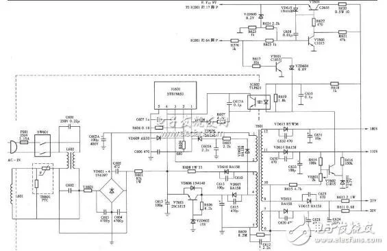3、保護回路:U1芯片本身和3腳外圍電路構(gòu)成過流保護回路;N1繞組上并聯(lián)的D1、R1、C9元件構(gòu)成了開關(guān)管的反向電壓吸收保護電路,以提供Q1截止時的反向電流通路,保障Q1的工作安全;實質(zhì)上穩(wěn)壓回路的電壓反饋信號,也可看作是一路電壓保護信號——當(dāng)反饋電壓幅度達一定值時,電路實施停振保護動作;24V的輸出端并聯(lián)有由R18、ZD2、單向晶閘管SCR組成的過壓保護電路,當(dāng)穩(wěn)壓電路失常,引起輸出電壓異常上升時,穩(wěn)壓二極管ZD2的擊穿為SCR提供觸發(fā)電流,SCR的導(dǎo)通形成一個“短路電流”信號,強制U1內(nèi)部保護電路產(chǎn)生過流保護動作,電路處于停振狀態(tài)。
