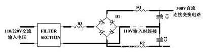 上圖所示為串聯(lián)電阻法沖擊電流控制電路(適用于橋式整流和倍壓電路,其沖擊電流相同),對(duì)于110V、220V雙電壓輸入電路,應(yīng)該在R1和R2位置放兩個(gè)電阻,這樣在110V輸入連接線(xiàn)連接時(shí)和220V輸入連接線(xiàn)斷開(kāi)時(shí)的沖擊電流一樣大。對(duì)于單輸入電壓電路,應(yīng)該在R3位置放電阻。