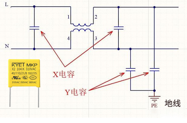 開關電源中的安規(guī)電容一般有X電容和Y電容,X電容是安裝在零線與火線之間,Y電容一般是安裝在地線與火線或地線與零線之間,具體的用法如下圖所示:
