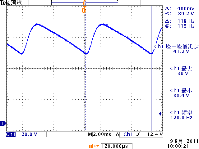 低頻紋波是與輸出電路的濾波電容容量相關(guān)。由于開關(guān)電源體積的限制,電解電容的容量不可能無限制地增加,導(dǎo)致輸出低頻紋波的殘留,該輸出紋波頻率隨整流電路方式的不同而不同。