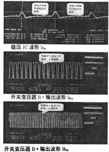 鑒于上述工作原理,對(duì)故障現(xiàn)象及原因分析:我廠生產(chǎn)的AT2516UG機(jī)器,在電源工作時(shí),開關(guān)變壓器有明顯的“哧、哧”聲,根據(jù)以往經(jīng)驗(yàn)判斷此響聲為開關(guān)變壓器工作時(shí)產(chǎn)生的噪聲。由此,對(duì)開關(guān)變壓器次級(jí)(12)B+腳進(jìn)行波形測(cè)試,具體測(cè)試如下: