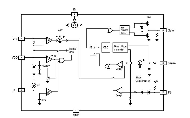 4.RI:參閱設(shè)置端。經(jīng)過連接一個電阻接地來為SG6841供給一個穩(wěn)定的電流,改動電阻阻值將改動PWM的頻率。