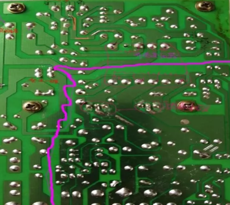 220V交流輸入,通過保險,負溫度熱敏電阻,安規(guī)電容,共模電感組成的抗電磁干擾電路及過流保護電路,經過整流二極管整流濾波后輸出300V左右的直流電壓。這是電源板正面圖,用紅線畫出的部分為熱地與冷地部分(開關電源接地方式有熱地和冷地之分,與220V電源直接相連的地稱為熱地,人體直接接觸會觸電;經開關變壓器隔離后,再整流濾波后的地稱為冷地,人體直接接觸不會觸電)。這是電路板背面圖,在圖中標出開關電源的輸入部分、300V濾波大電容、開關管、開關變壓器、肖特基二極管等主要元器件。