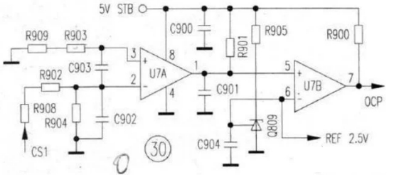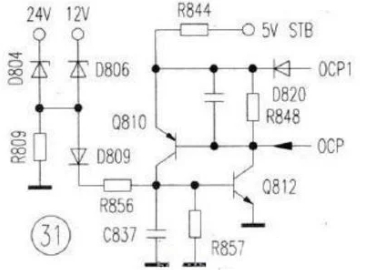 3、保護(hù)回路:U1芯片自身和3腳外圍電路構(gòu)成過流保護(hù)回路;N1繞組上并聯(lián)的D1、R1、C9元件構(gòu)成了開關(guān)管的反向電壓吸收保護(hù)電路,以供給Q1截止時(shí)的反向電流通路,確保Q1的作業(yè)安全;實(shí)質(zhì)上穩(wěn)壓回路的電壓反響信號(hào),也可看作是一路電壓保護(hù)信號(hào)——當(dāng)反響電壓崎嶇達(dá)一定值時(shí),電路實(shí)施停振保護(hù)動(dòng)作;24V的輸出端并聯(lián)有由R18、ZD2、單向晶閘管SCR組成的過壓保護(hù)電路,當(dāng)穩(wěn)壓電路反常,引起輸出電壓反常上升時(shí),穩(wěn)壓二極管ZD2的擊穿為SCR供給觸發(fā)電流,SCR的導(dǎo)通形成一個(gè)“短路電流”信號(hào),強(qiáng)制U1內(nèi)部保護(hù)電路發(fā)生過流保護(hù)動(dòng)作,電路處于停振情況。