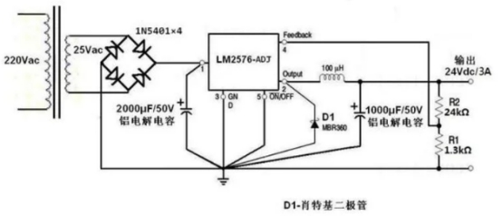 有用電路如下圖,比例電阻R1和R2的阻值之比設(shè)置為1:18.51,輸出電壓就等于24伏。