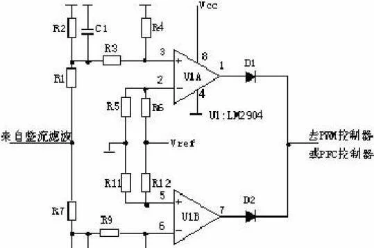 AC輸入和DC輸入的開關(guān)電源的輸入過欠壓維護(hù)原理大致相同。維護(hù)電路的取樣電壓均來自輸入濾波后的電壓。取樣電壓分為兩路,一路經(jīng)R1、R2、R3、R4分壓后輸入比較器3腳,如取樣電壓高于2腳基準(zhǔn)電壓,比較器1腳輸出高電平去操控主操控器使其關(guān)斷,電源無輸出。另一路經(jīng)R7、R8、R9、R10分壓后輸入比較器6腳,如取樣電壓低于5腳基準(zhǔn)電壓,比較器7腳輸出高電平去操控主操控器使其關(guān)斷,電源無輸出。