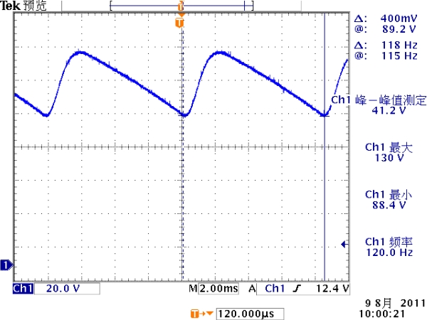 低頻紋波是與輸出電路的濾波電容容量相關(guān)。因?yàn)殚_(kāi)關(guān)電源體積的約束,電解電容的容量不可能無(wú)約束地添加,導(dǎo)致輸出低頻紋波的殘留,該輸出紋波頻率隨整流電路方式的不同而不同。