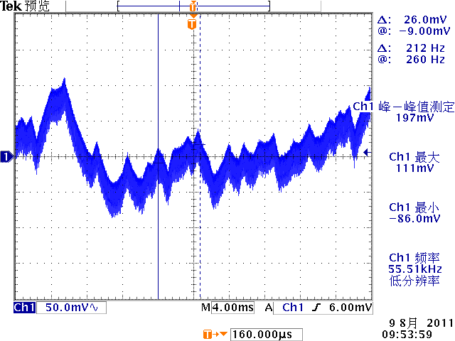 低頻紋波是與輸出電路的濾波電容容量相關(guān)。因?yàn)殚_(kāi)關(guān)電源體積的束縛,電解電容的容量不或許無(wú)束縛地添加,導(dǎo)致輸出低頻紋波的殘留,該輸出紋波頻率隨整流電路方式的不同而不同。