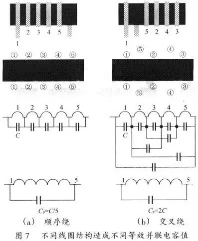 在開關(guān)電源中電感的Cp應(yīng)該控制得越小越好。一起有必要留心到,同一電感量的電感會由于線圈結(jié)構(gòu)不同而產(chǎn)生不同的Cp值。圖7就閃現(xiàn)了同一電感量的電感在二種不同的線圈結(jié)構(gòu)下不同的Cp值。圖7(a)電感的5匝繞組是按次第繞制。這種線圈結(jié)構(gòu)的Cp值是l匝線圈等效并聯(lián)電容值(C)的1/5。圖7(b)電感的5匝繞組是按穿插次第繞制。其間繞組4和5放置在繞組1、2、3之間,而繞組l和5非??拷_@種線圈結(jié)構(gòu)所產(chǎn)牛的Cp是1匝線圈C值的兩倍。