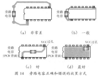 旁路電容(Decouple)的放置也要考慮到它的串聯(lián)電感值。旁路電容有必要是低阻抗和低ESL乩的瓷片電容。但假設(shè)一個高品質(zhì)瓷片電容在PCB上放置的辦法不對,它的高頻濾波功用也就消失了。圖14閃現(xiàn)了旁路電容正確和差錯的放置辦法。