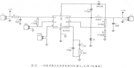 4、開關(guān)電源PCB排版例2圖22是另一種降壓式開關(guān)電源,該電源能使12V輸入電壓轉(zhuǎn)換成3.3V輸出電壓,輸出電流可達3A。此電源上運用了一個集成電源控制器(Semtech類型SC4519)。這種控制器將一個功率管集成在電源控制器芯片中。這樣的電源非常簡略,特別適宜應(yīng)用在便攜式DVD機,ADSL,機頂盒等消費類電子產(chǎn)品。