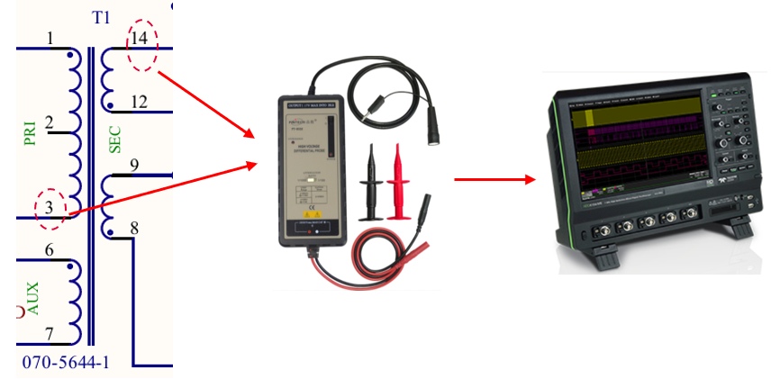 回到本文的重點(diǎn),接下來測試一次側(cè)高壓端與SELV電路之間的重復(fù)峰值電壓是否超過750V閾值電壓。有經(jīng)驗(yàn)的同學(xué)都知道,在開關(guān)電源中,重點(diǎn)是要找到變換器中的“動點(diǎn)”,也就是電壓的變化率dv/dt最大的節(jié)點(diǎn),在圖5中,一次側(cè)高壓端的監(jiān)測點(diǎn)就可以選為Q1的Drain極,也就是變壓器T1的pin 3,安全二次側(cè)SELV的監(jiān)測點(diǎn)既可以選擇變壓器T1的pin 12,也可以選擇變壓器T1的pin 14,最后以正常帶載工況下一次側(cè)、二次側(cè)之間檢測到最大電壓為作為設(shè)定局部放電電壓UPD的基準(zhǔn)。