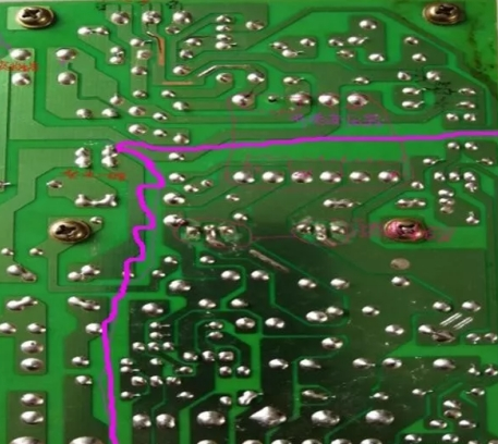 220V交流輸入,通過保險,負溫度熱敏電阻,安規(guī)電容,共模電感組成的抗電磁干擾電路及過流保護電路,通過整流二極管整流濾波后輸出300V左右的直流電壓。這是電源板正面圖,用紅線畫出的部分為熱地與冷地部分(開關(guān)電源接地方式有熱地和冷地之分,與220V電源直接相連的地稱為熱地,人體直接觸摸會觸電;經(jīng)開關(guān)變壓器阻隔后,再整流濾波后的地稱為冷地,人體直接觸摸不會觸電)。這是電路板反面圖,在圖中標出開關(guān)電源的輸入部分、300V濾波大電容、開關(guān)管、開關(guān)變壓器、肖特基二極管等首要元器材。