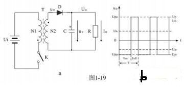 圖1-19-a是反激式變壓器開關(guān)電源的簡(jiǎn)單工作原理圖,圖1-19-a中,Ui是開關(guān)電源的輸入電壓,T是開關(guān)變壓器,K是控制開關(guān),C是儲(chǔ)能濾波電容,R是負(fù)載電阻。圖1-19-b是反激式變壓器開關(guān)電源的電壓輸出波形。