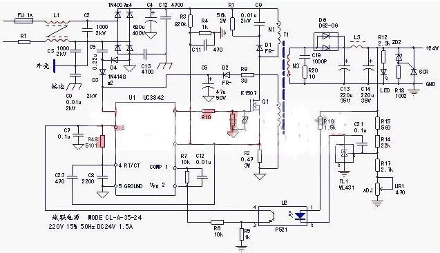 U1芯片和1、2腳外圍元件R7、C12,也是穩(wěn)壓回路的一部分。實際上,TL1、U1組成了(相對于U1內(nèi)部電壓誤差放大器)外部誤差放大器,將輸出24V的電壓變化反饋回U1的反饋電壓信號輸入端。