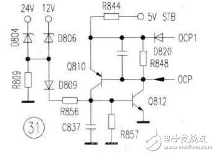 3、保護回路:U1芯片本身和3腳外圍電路構(gòu)成過流保護回路;N1繞組上并聯(lián)的D1、R1、C9元件構(gòu)成了開關(guān)管的反向電壓吸收保護電路,以提供Q1截止時的反向電流通路,保障Q1的工作安全;實質(zhì)上穩(wěn)壓回路的電壓反饋信號,也可看作是一路電壓保護信號——當(dāng)反饋電壓幅度達一定值時,電路實施停振保護動作;24V的輸出端并聯(lián)有由R18、ZD2、單向晶閘管SCR組成的過壓保護電路,當(dāng)穩(wěn)壓電路失常,引起輸出電壓異常上升時,穩(wěn)壓二極管ZD2的擊穿為SCR提供觸發(fā)電流,SCR的導(dǎo)通形成一個“短路電流”信號,強制U1內(nèi)部保護電路產(chǎn)生過流保護動作,電路處于停振狀態(tài)。