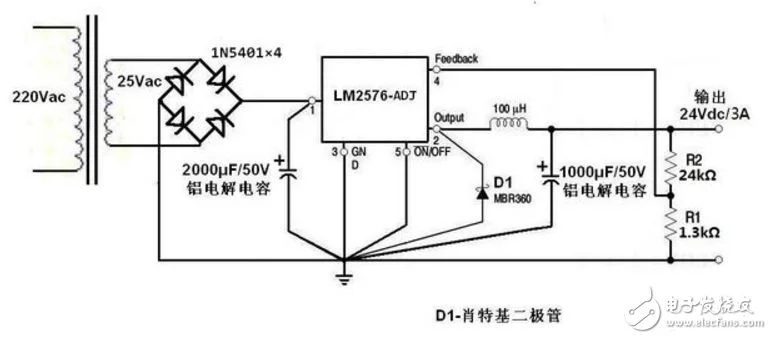 實用電路如下圖,比例電阻R1和R2的阻值之比設(shè)置為1:18.51,輸出電壓就等于24伏。